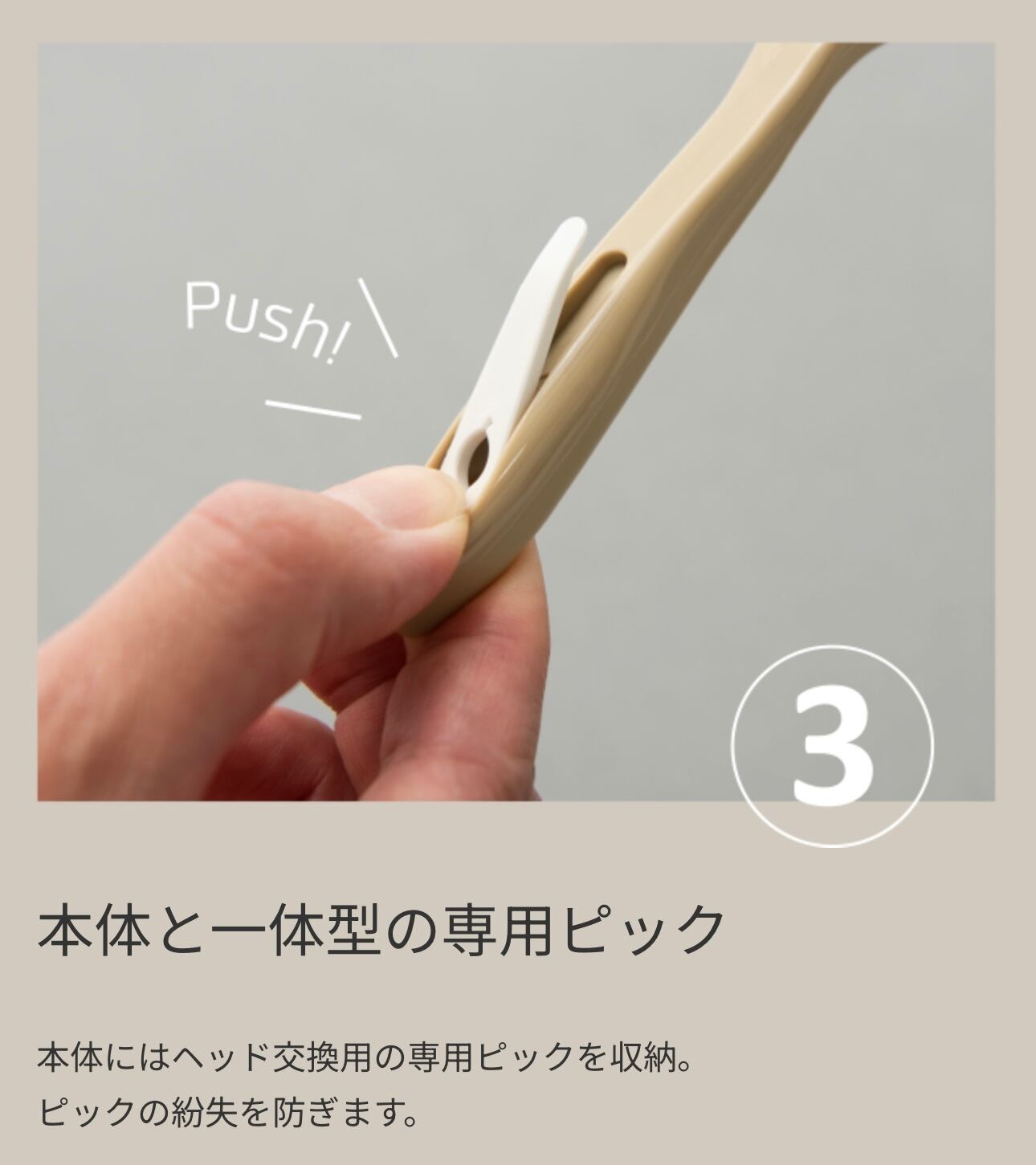 専用ピックを本体とヘッド部分の隙間に差し込むことで、簡単に取り外すことができます。本体と一体型の専用ピック